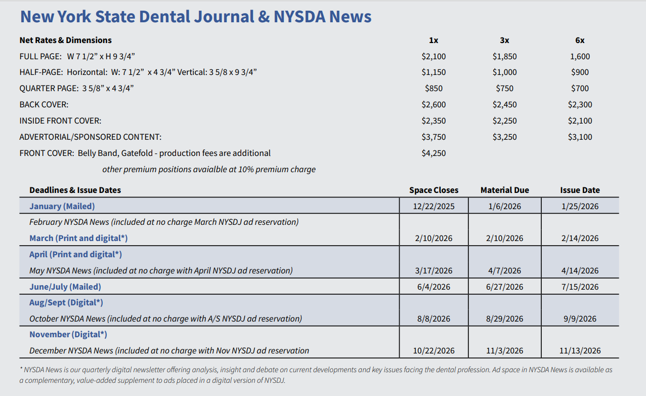 For more information on NYSDA advertising options, contact Jeanne Deguire, Advertising & Sponsorship Manager by email: jdeguire@nysdental.org or call the NYSDA office at (518) 465-0044.